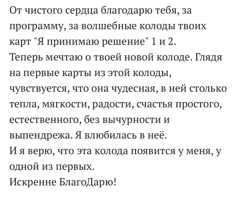 - Автор 13 МАК-колод, одна из которых стала Лауреатом 1 степени международной премии «Золотая метафора» в номинации «Открытие года» и «Любимая колода». Метафорические карты "Я принимаю решение", "Я принимаю решение"-2, "Радости кажого дня", "Переопредели!", "Моя SUPER сила", "Моя SUPER сила"-2, "Высокие вибрации/High Vibes", "Низкие вибрации/Low Vibes", "Female. Женские роли", "Male. Мужские роли", "Хроники Акаши", "Навстречу страху";